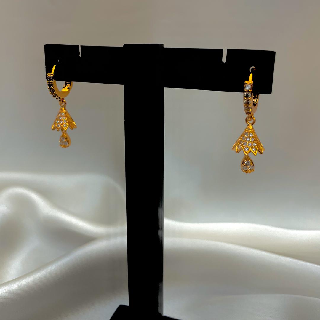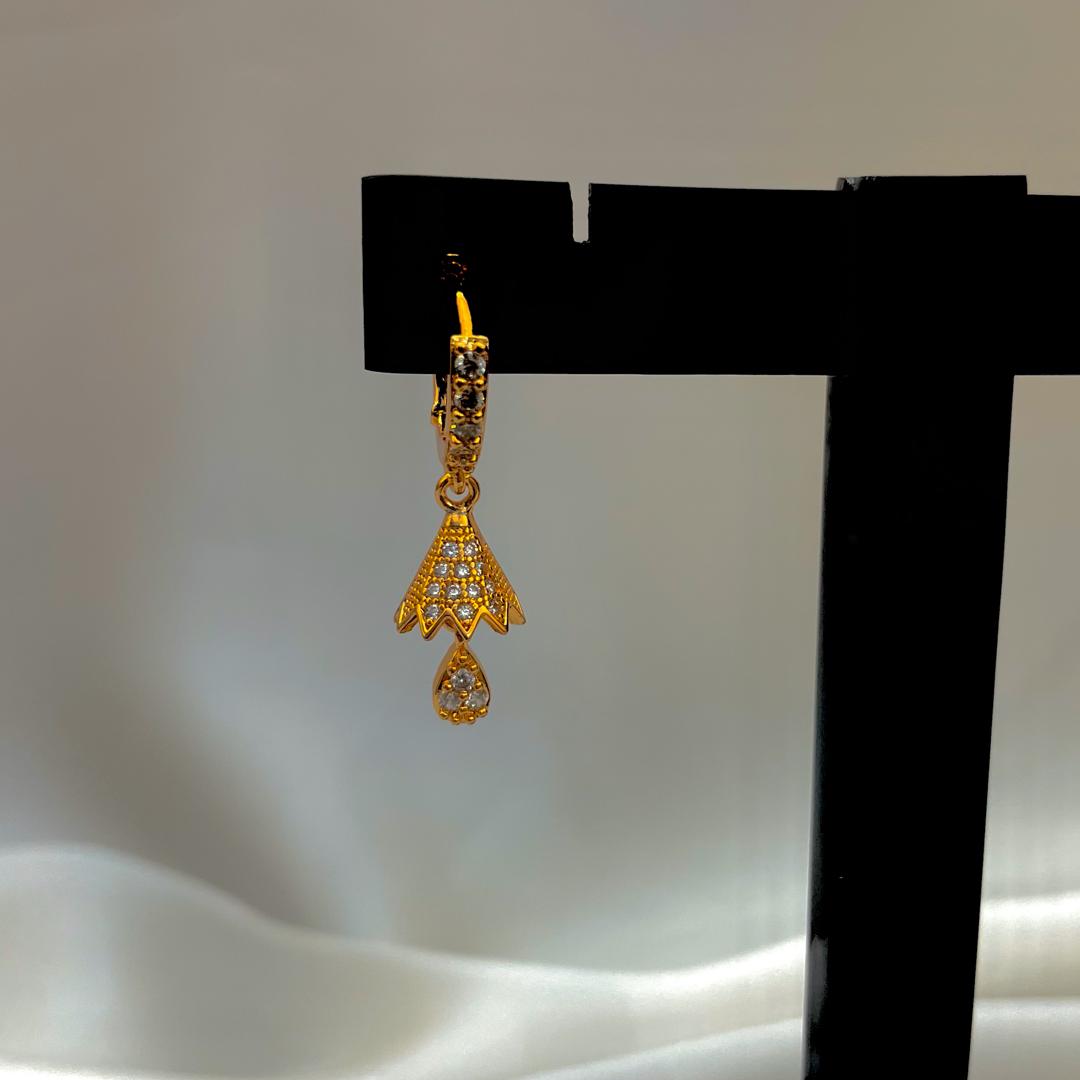 A blend of elegance and grace, Zarqa earrings bring a delicate charm to your jewelry collection. Featuring a graceful floral fan design adorned with shimmering crystals, these drop earrings are perfect for weddings, formal events, or elevating your everyday look.