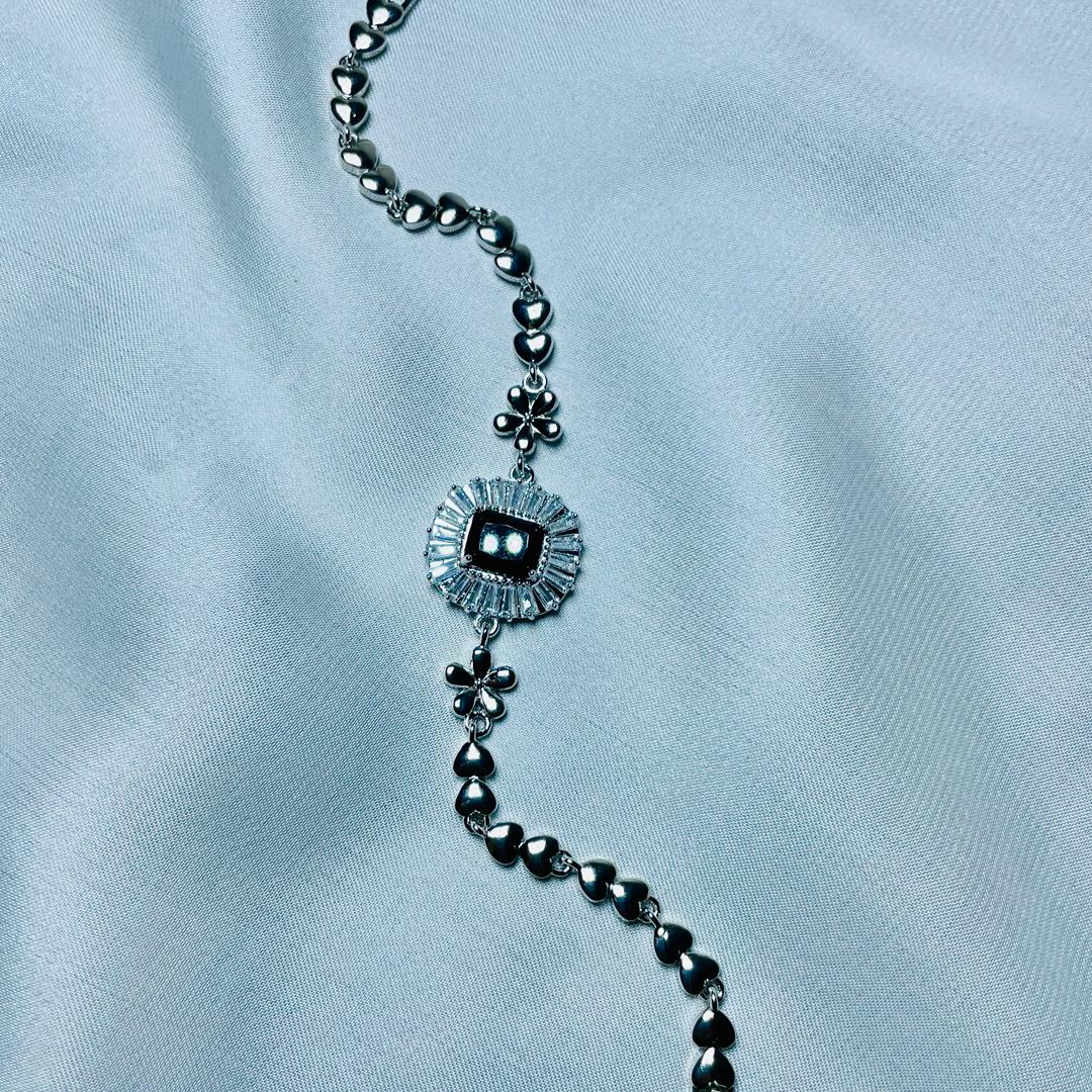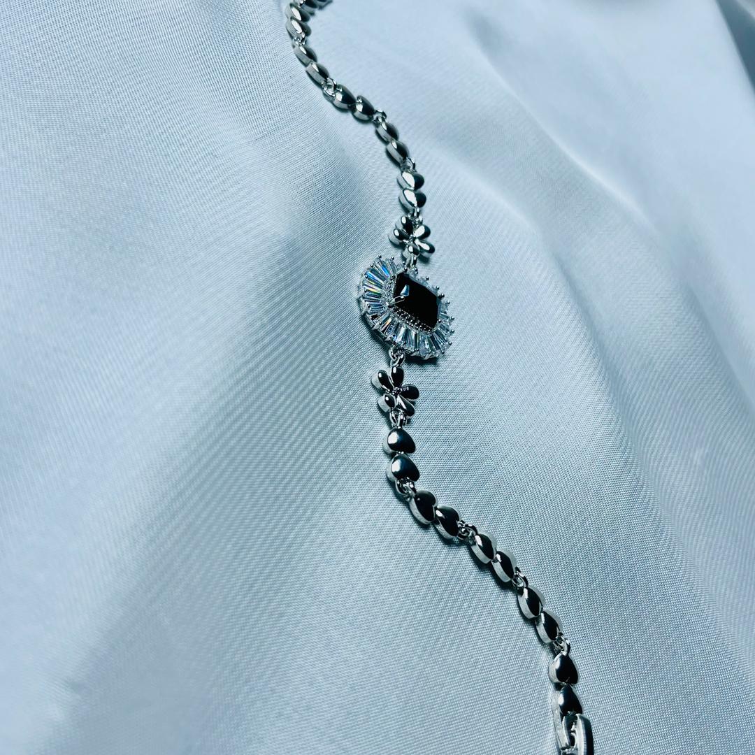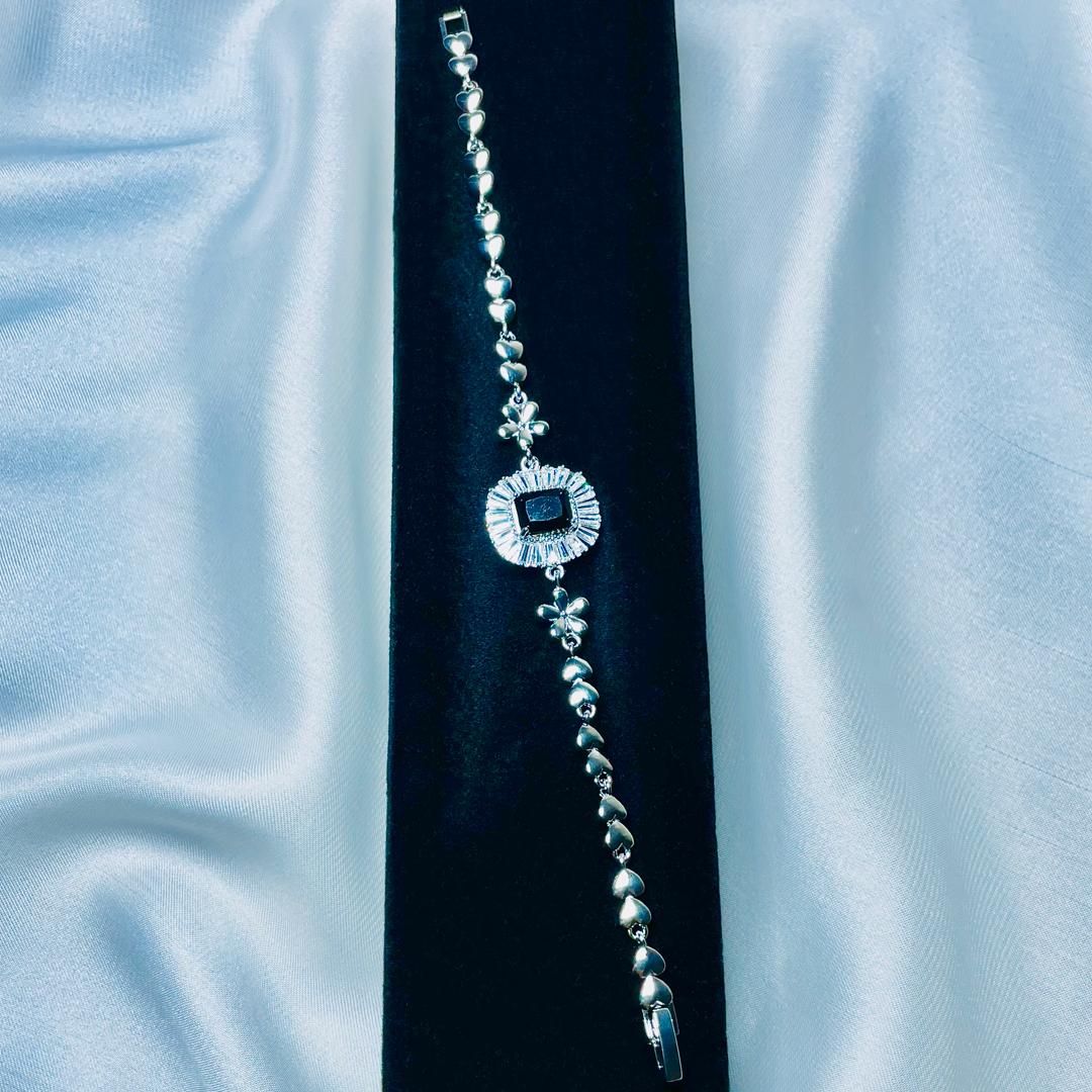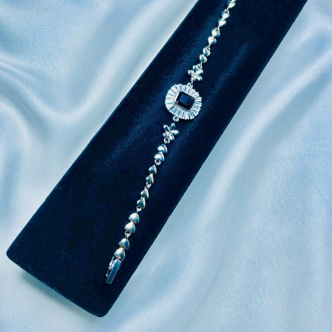 Elevate your style with this stunning silver bracelet, featuring a bold black onyx centerpiece surrounded by shimmering zirconia stones. Designed with delicate floral and heart-shaped links, this bracelet exudes sophistication and charm. Whether it's a special occasion or a casual day out, this piece adds the perfect touch of elegance!
