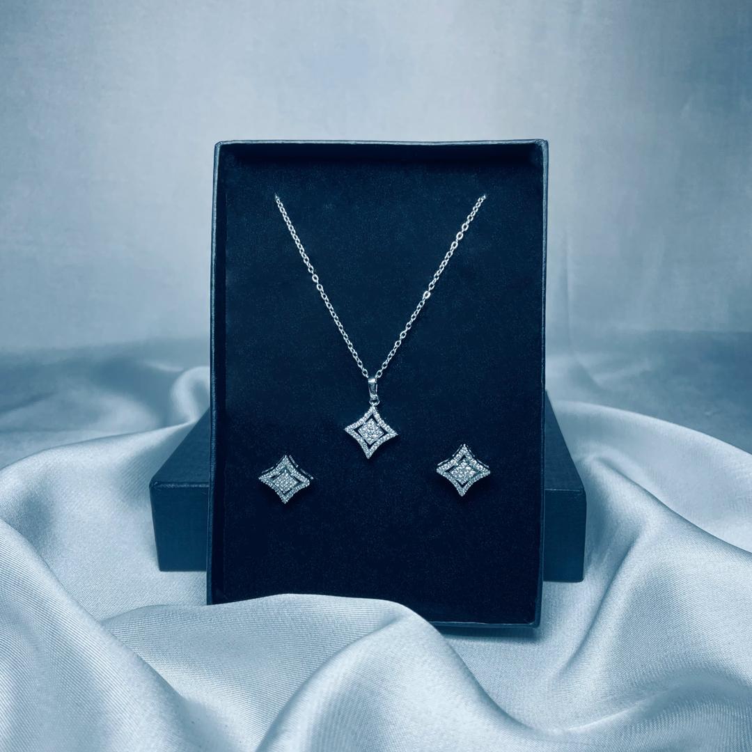 Add a touch of elegance to your collection with this diamond-shaped silver jewelry set, featuring a stunning pendant necklace and matching earrings. Designed with intricate zirconia embellishments, this set radiates sophistication and charm. The versatile design makes it perfect for both formal occasions and everyday wear.