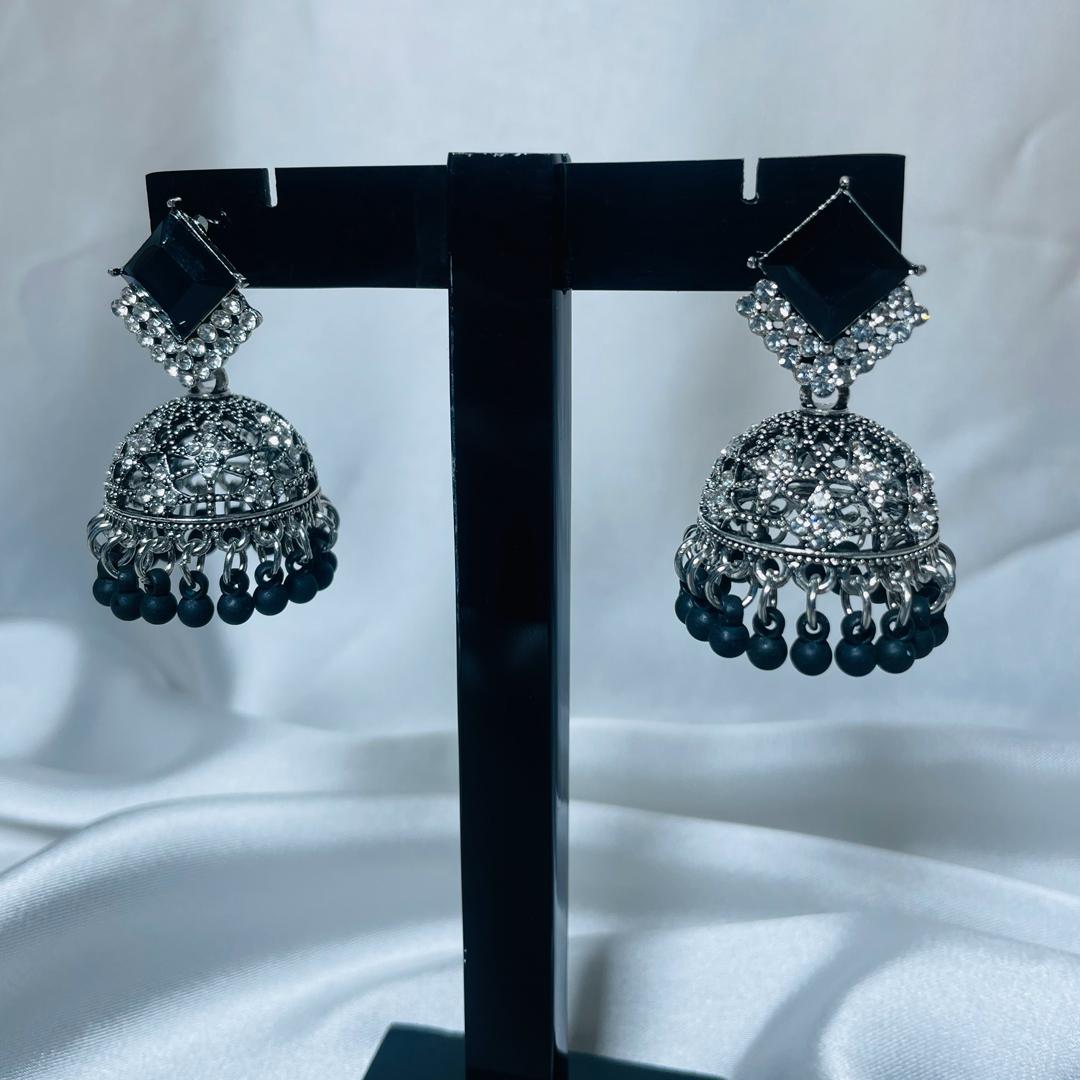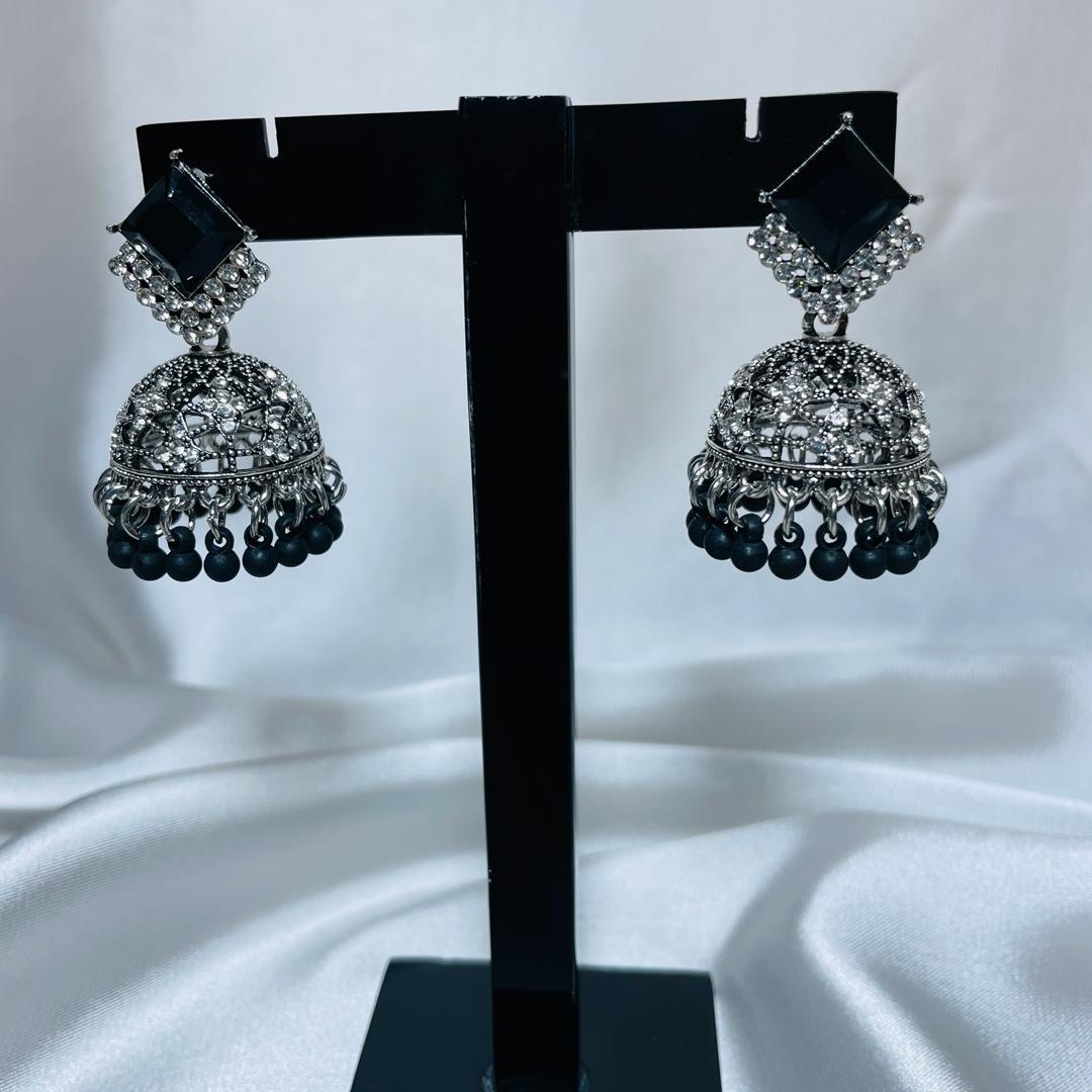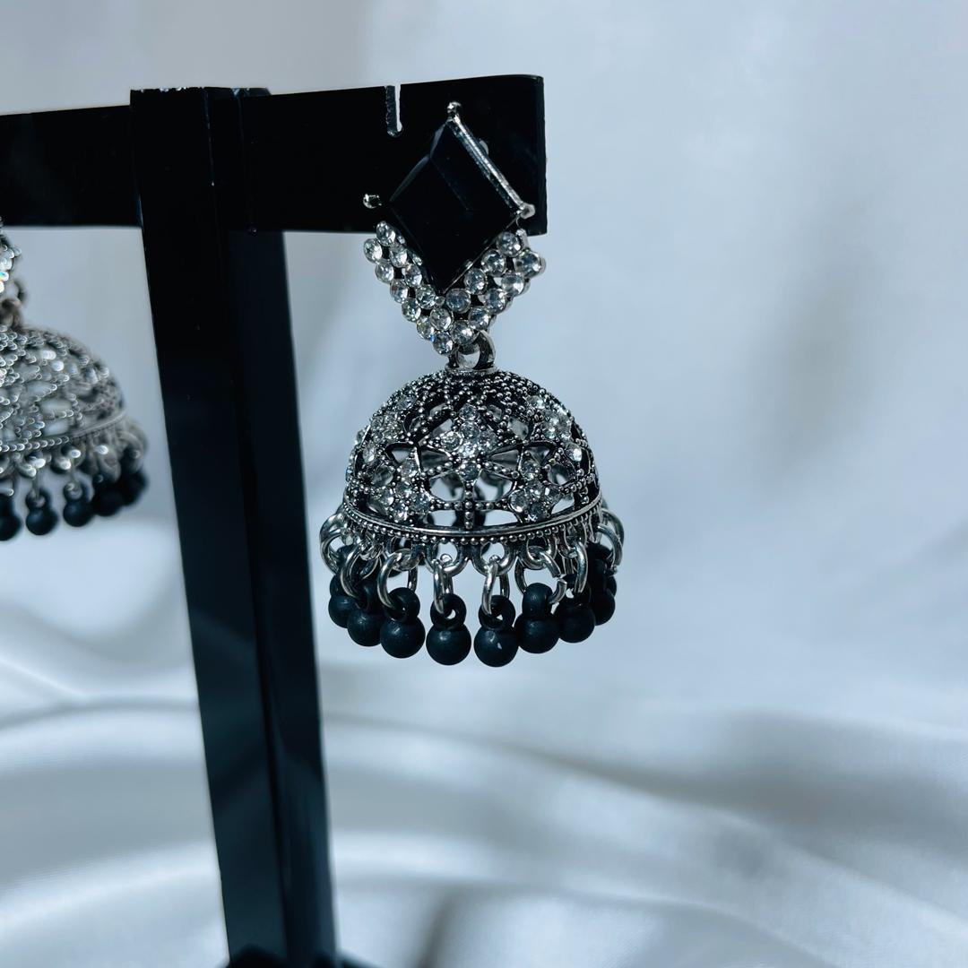 Elevate your traditional look with the timeless charm of Midnight Meena. These oxidized silver jhumkas are intricately detailed with stone embellishments and a black beaded finish, giving them a bold and elegant edge. Perfect for festive wear, weddings, or adding an ethnic twist to a casual outfit.