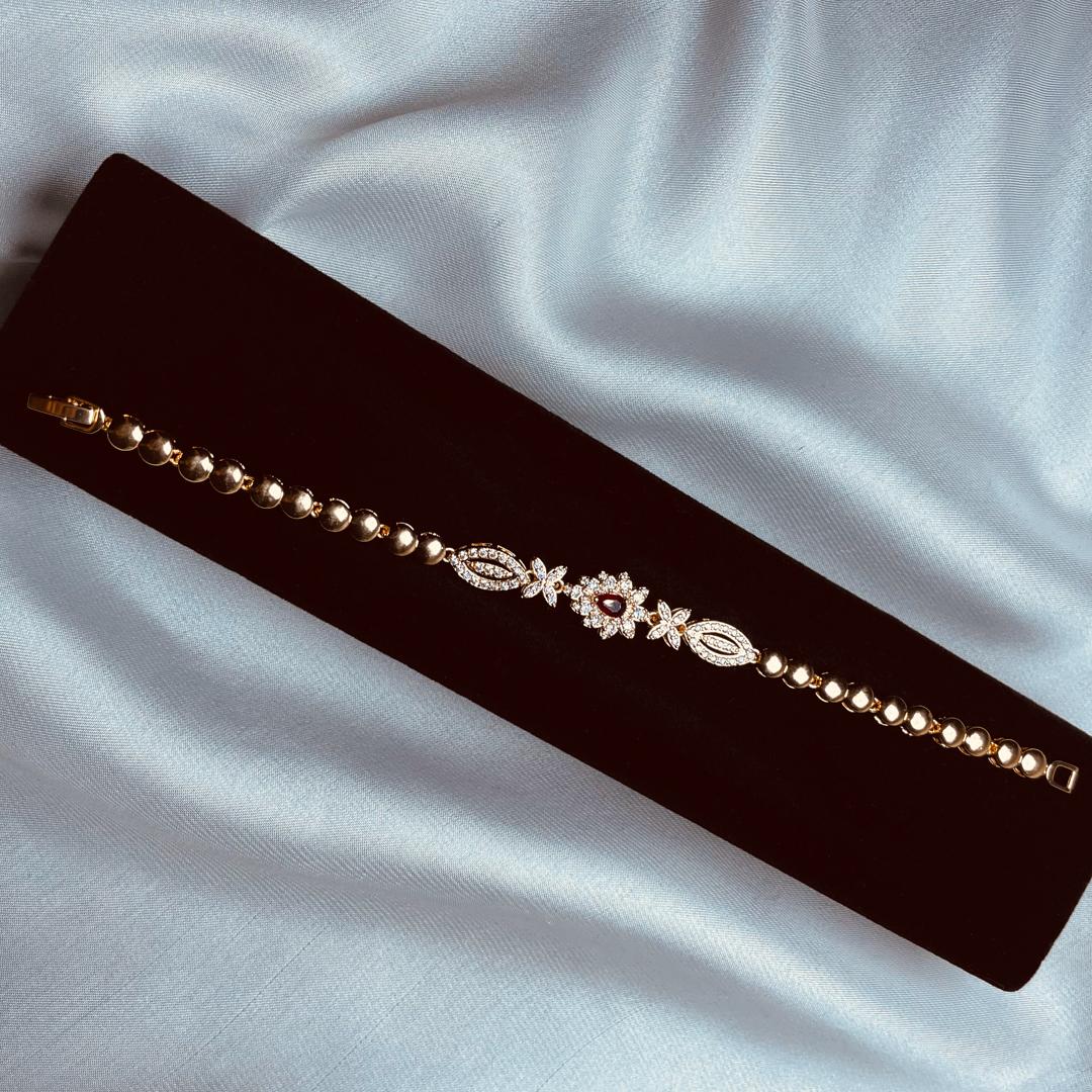 Add a touch of luxury and elegance to your jewelry collection with this exquisite gold-plated bracelet, featuring a stunning ruby-red centerpiece surrounded by sparkling zirconia stones. The intricate floral and leaf design enhances its charm, making it a perfect accessory for any occasion.