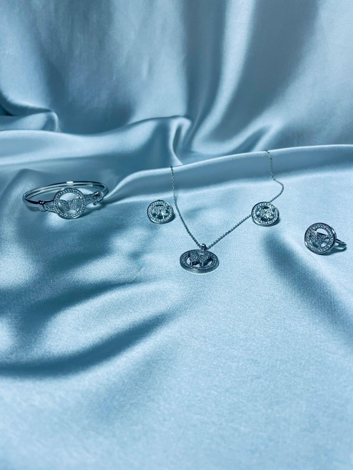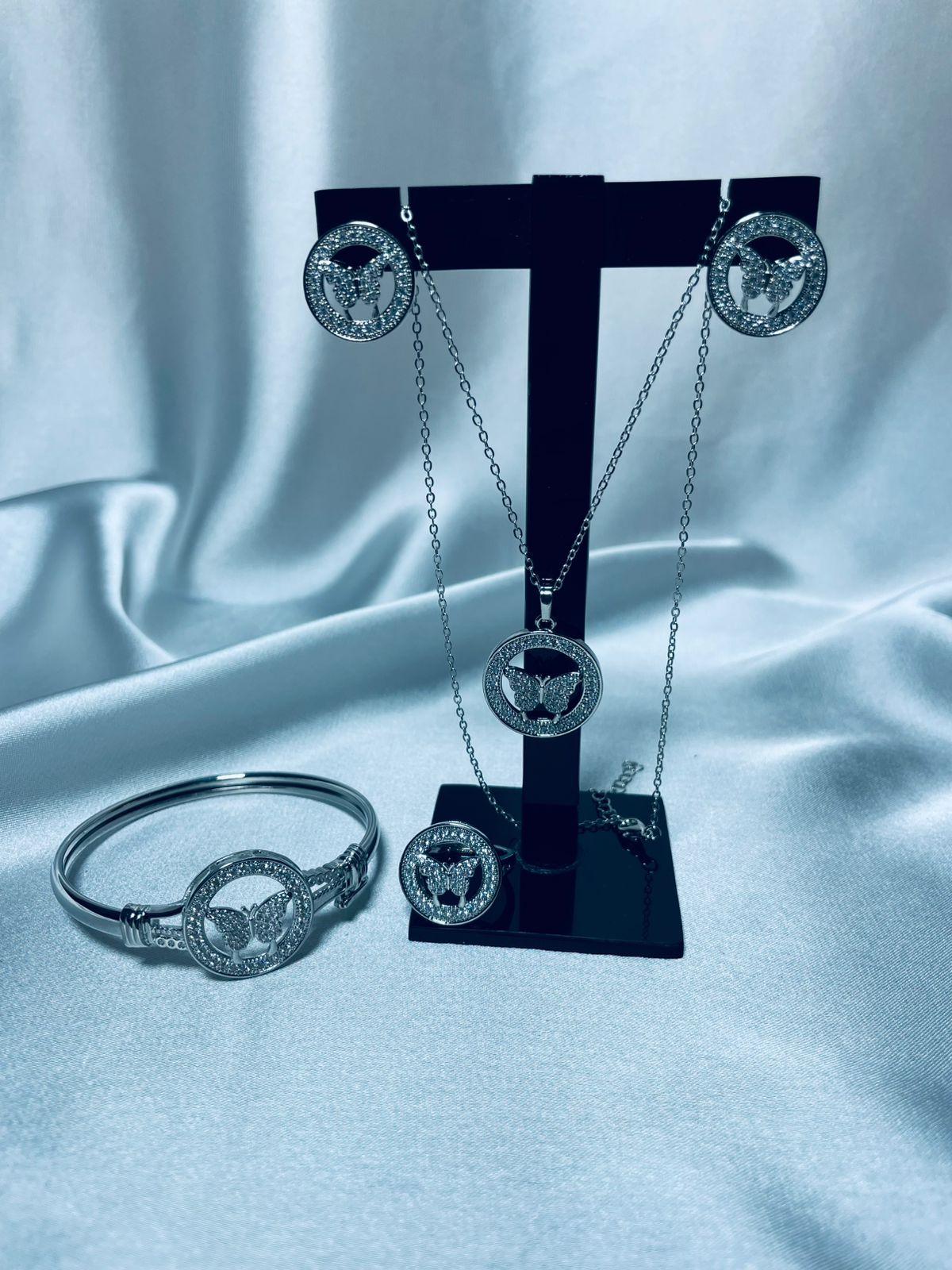 Graceful, delicate, and full of charm — our Parwana jewelry set is inspired by the ethereal beauty of butterflies. This complete set includes a beautifully designed butterfly motif necklace, earrings, a bangle, and a matching ring, perfect for festive occasions or an elegant evening look.